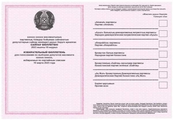 — для голосования на выборах депутатов Мажилиса Парламента, избираемых по партийным спискам (голубой цвет);