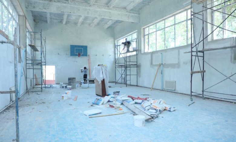 В общей средней школе №8 имени Айни в селе Капланбек и общей средней школе №13 Мәңгілік ел в селе Ынтымак ведутся работы по отделке внутренних стен, покраске и обновлению дверей и окон, электро- и тепловых сетей.