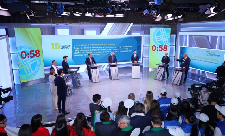 В диалоге участвовали 14 спикеров от 7 партий Казахстана, которые высказались о проекте Новой Конституции, отвечая на вопросы модераторов и простых казахстанцев.